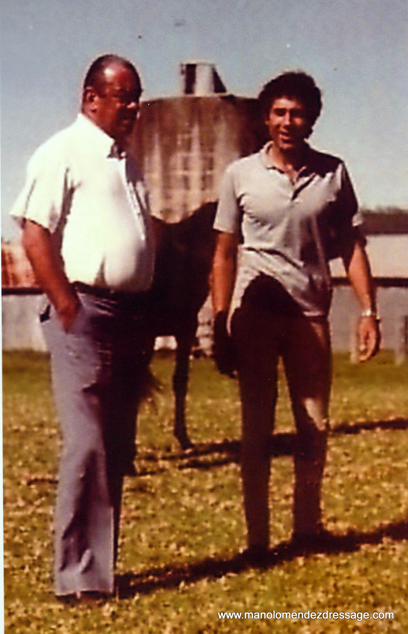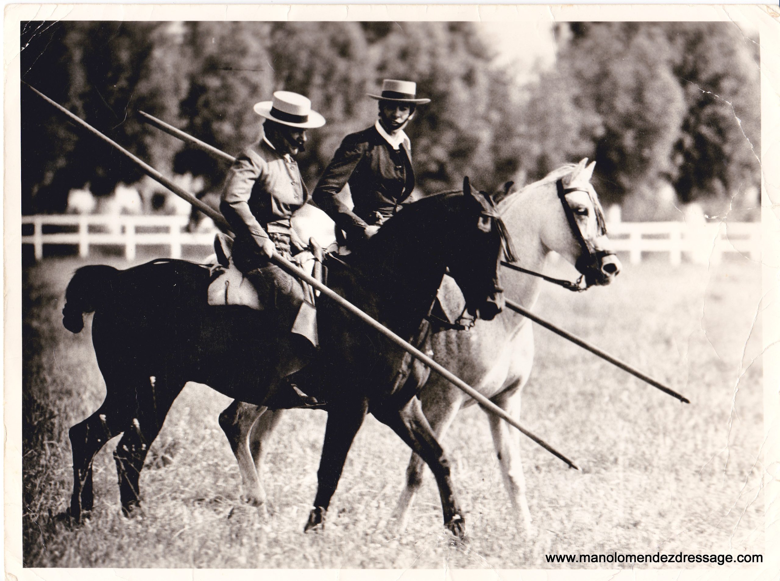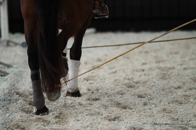 Manolo using two canes to assist a horse in executing evenness during a Piaffe lesson. Timing is everything!