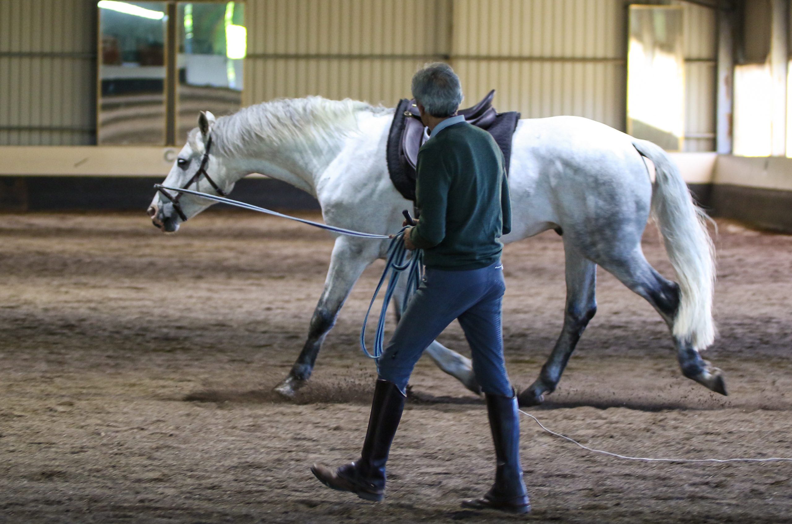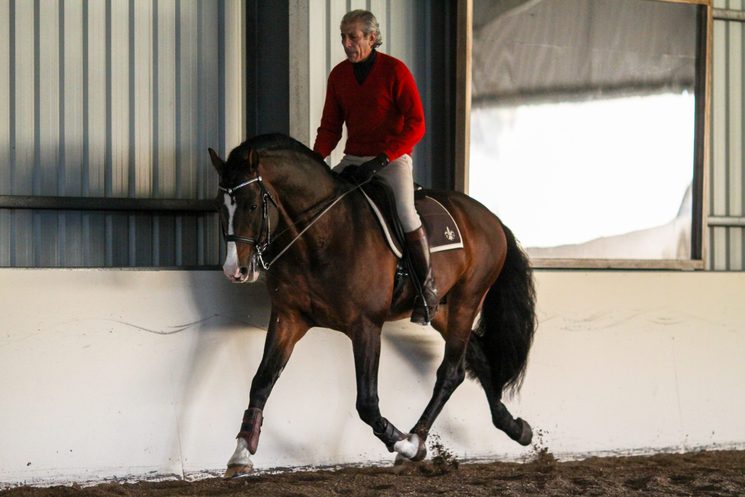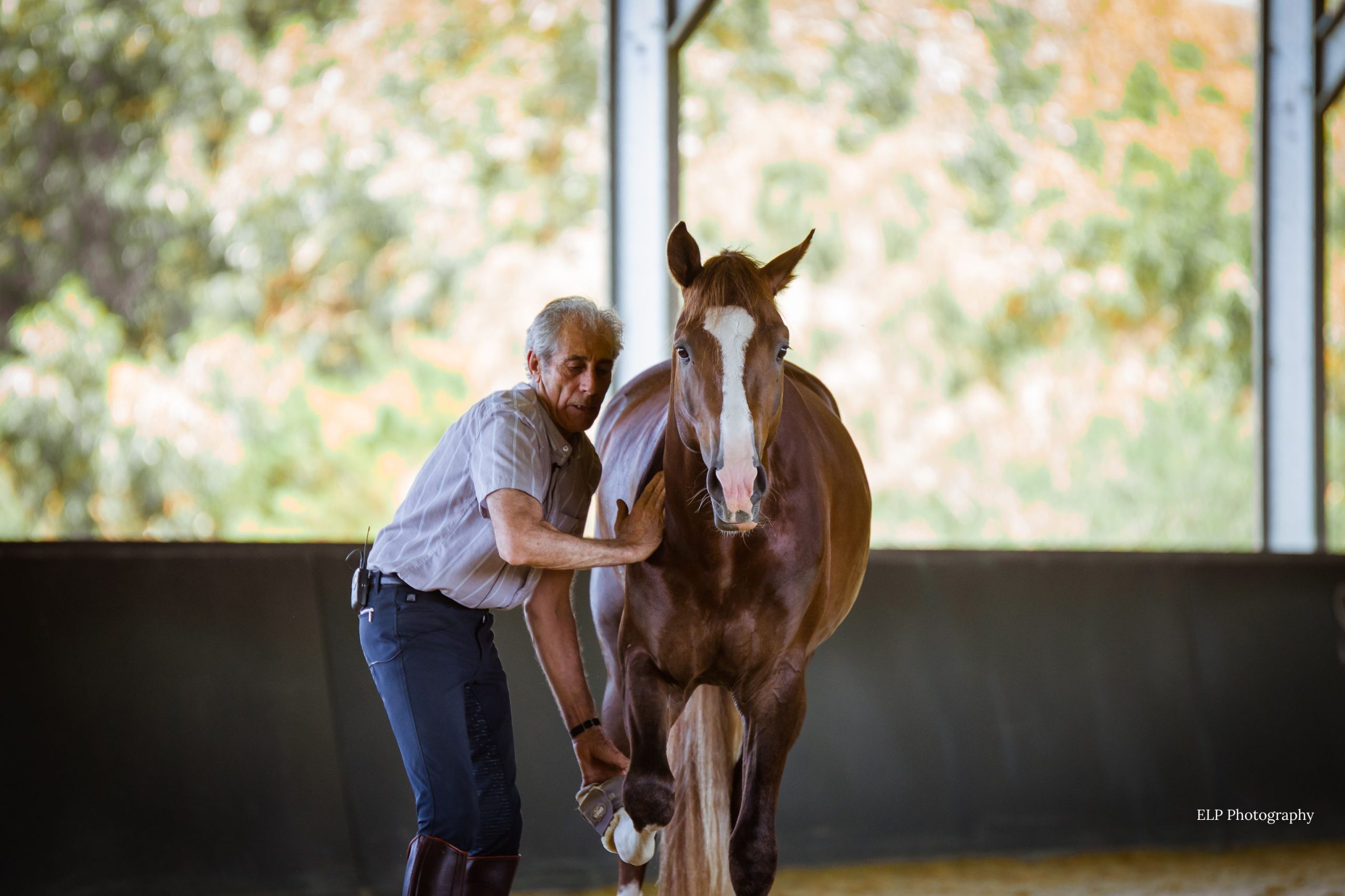 Manolo working with a young Jumping Stallion that is tired and sore in his body. He cannot ask for the perfect working posture all at once. Little by little you ask and change over time.