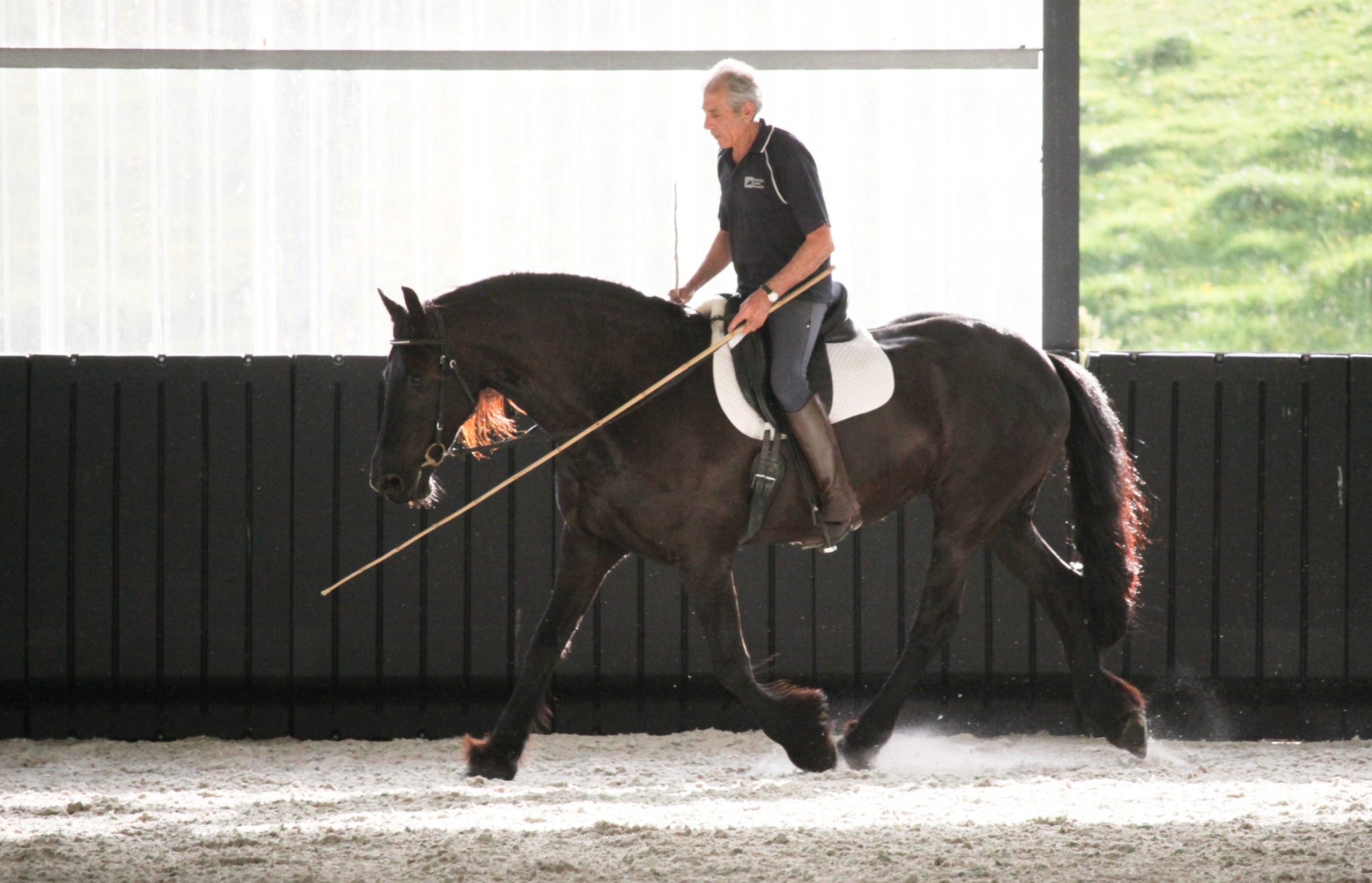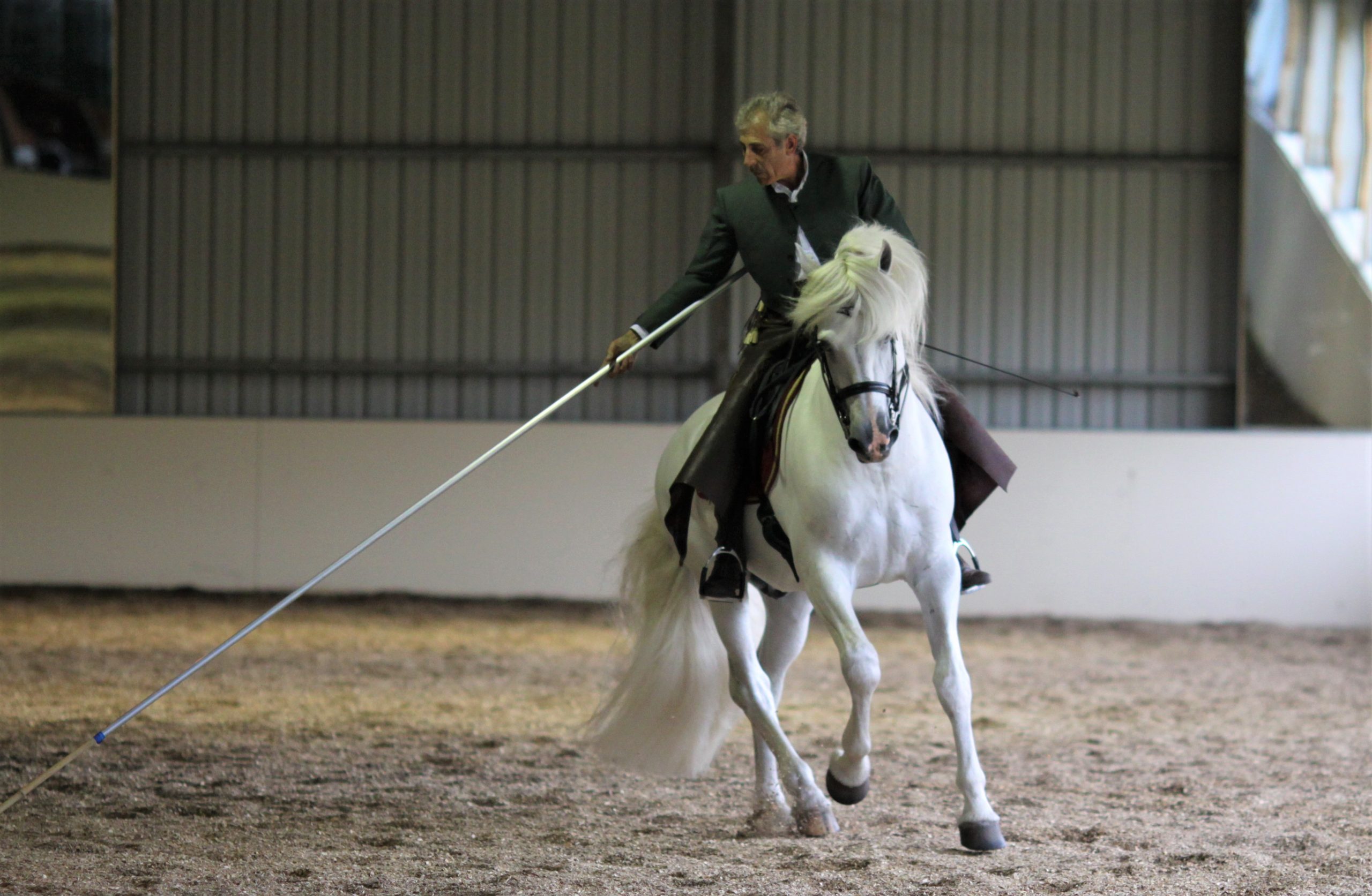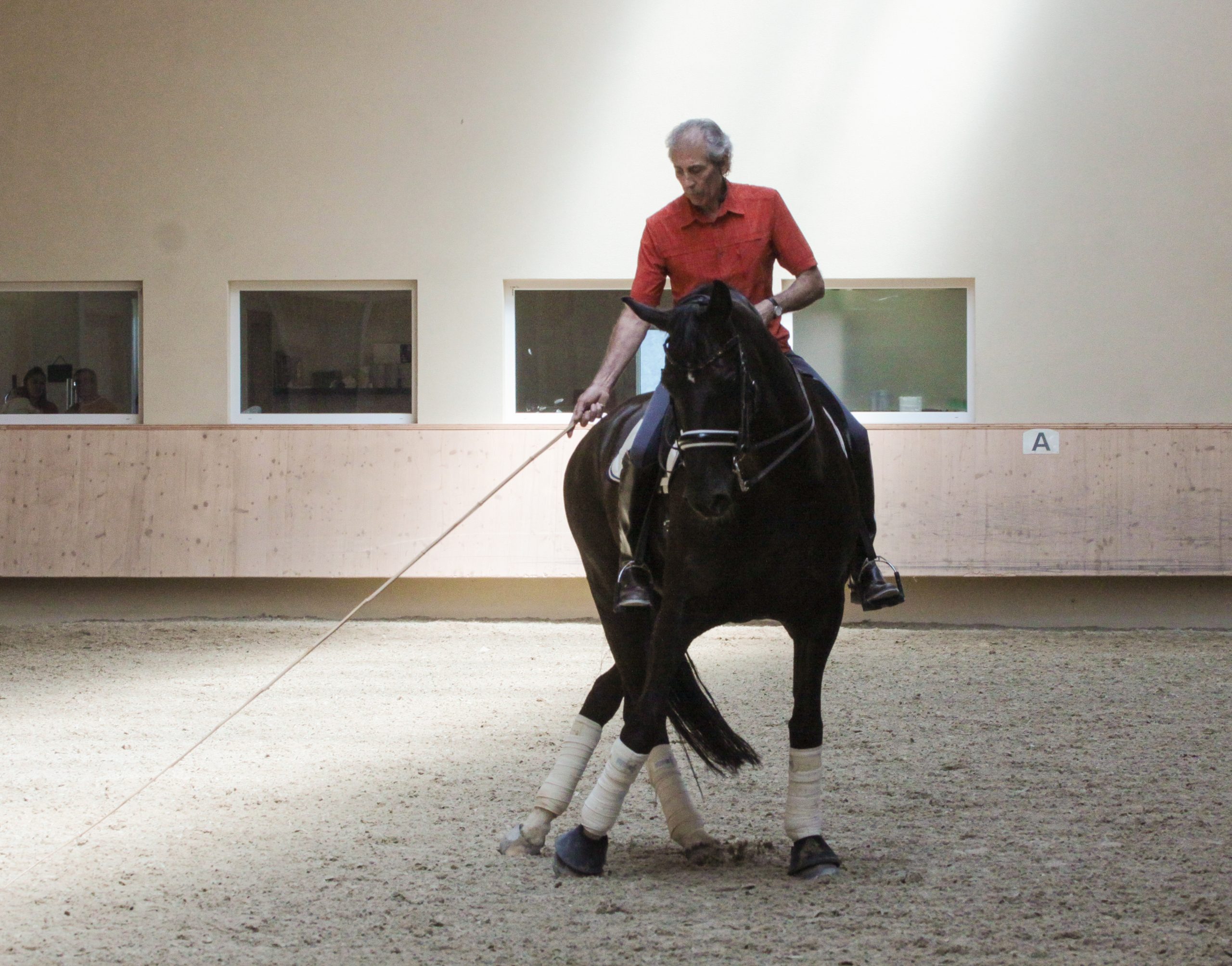 Austria, assisting a medium level horse in assisting him with his trademark tool – the bamboo cane to keep him straight and even in lateral movement.