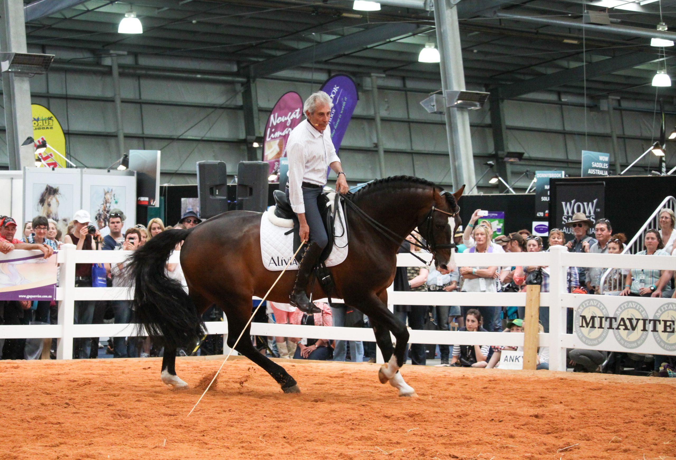 The ever-gentle Stallion Clint Eastwood and Manolo exhibiting during an Equitana Expo.